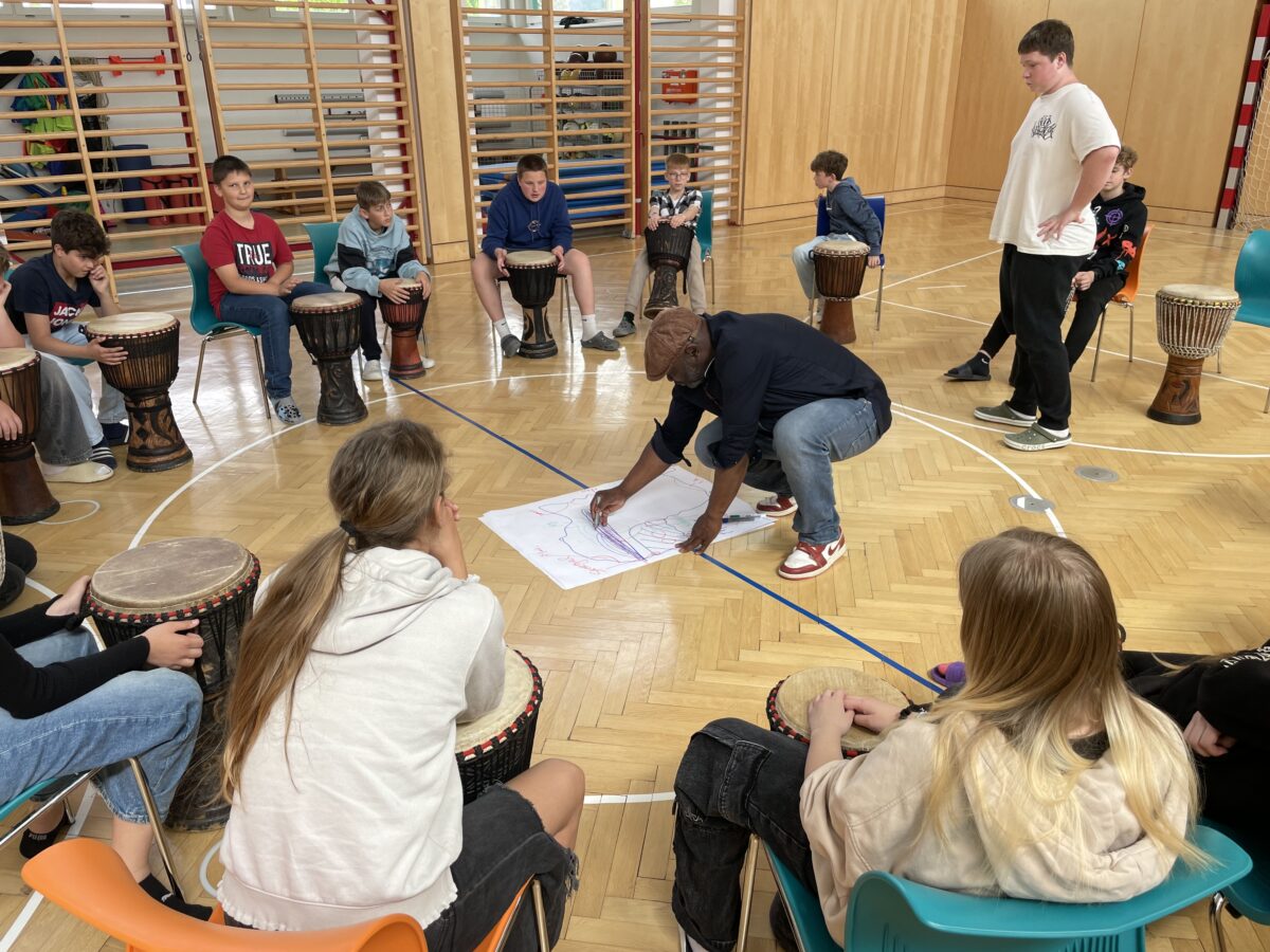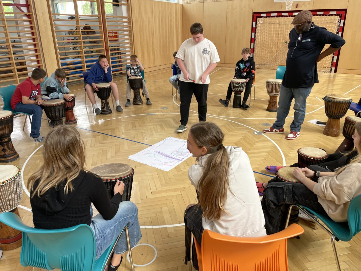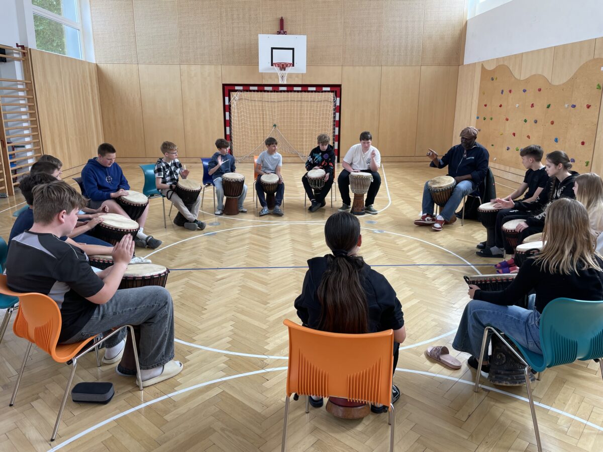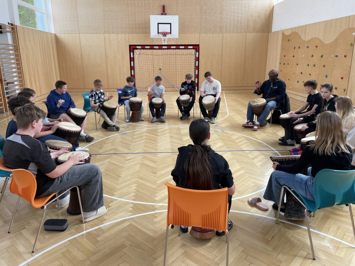 Im Trommel-Workshop mit Kamdem aus Kamerun, organisiert vom Verein Chiala, lernten die Kinder Rhythmen aus Afrika kennen und durften selbst auf echten Trommeln musizieren. Mitreißende Klänge und viel Freude am gemeinsamen Musizieren standen dabei im Mittelpunkt.